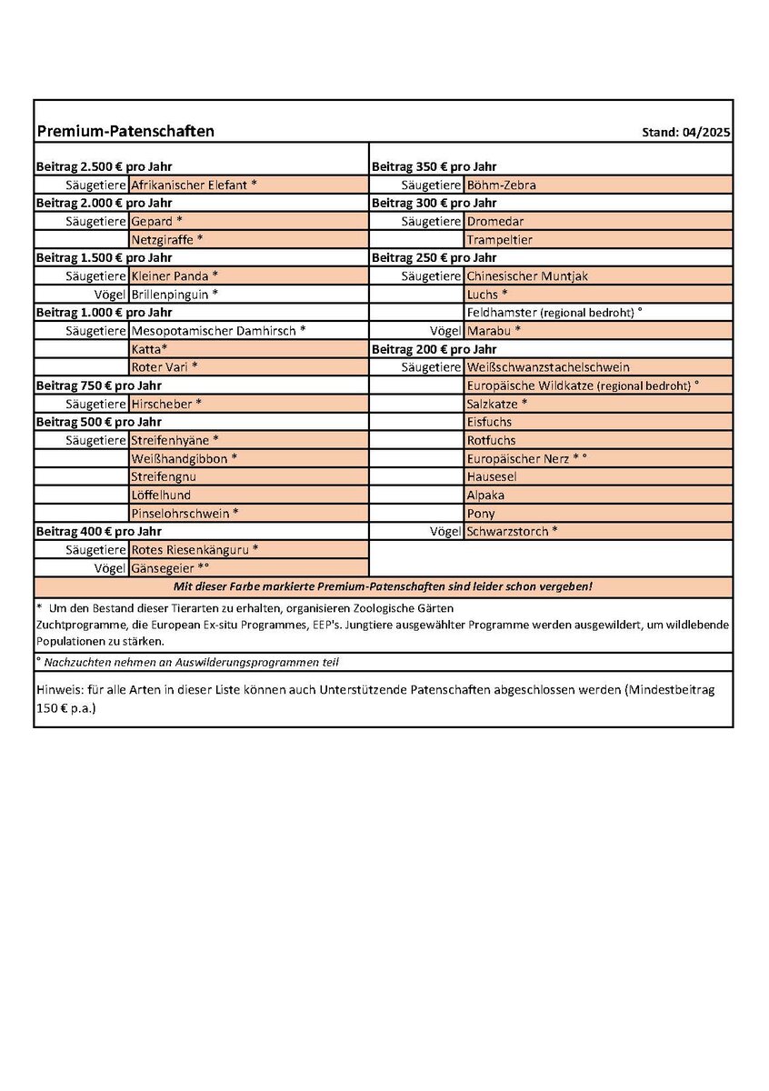 Für individuell unterscheidbare Tiere können Sie eine Premium-Patenschaft übernehmen. Für viele weitere Tierarten sind Unterstützende Patenschaften möglich. Die jeweiligen Minimumbeiträge entnehmen Sie bitte den Beitragslisten. Außerdem können Sie auch für jede Premium-Tierart eine unterstützende Patenschaft abschließen, der Minimumbeitrag hierfür beträgt jährlich 150 €.