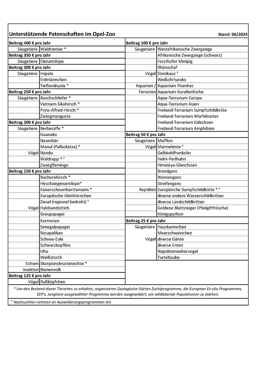 Die Jahresbeiträge betragen je nach Tierart zwischen 25 € und 2.500 €; für Bäume des Apfellehrpfads und des Lehrpfads „Baum des Jahres“ 150 € pro Baum.